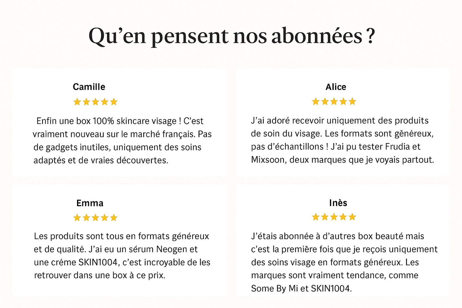 ✅ Choisis la formule qui te correspond le mieux : avec ou sans engagement, tu reçois chaque mois ta box skincare 🌿 coréenne directement chez toi.