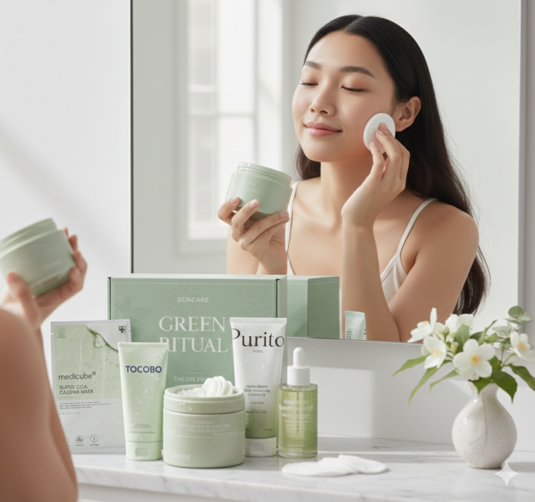🍃 Green Ritual est une routine skincare coréenne complète, pensée pour apaiser, hydrater et rééquilibrer les peaux sensibles.Chaque soin a été sélectionné pour travailler en synergie, sans surcharge ni incompatibilité, afin d’offrir à la peau confort, fraîcheur et sérénité au quotidien 🤍